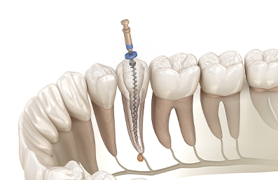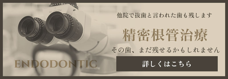 当院ではマイクロスコープとラバーダム防湿を使用した精密根管治療を実施しています。虫歯菌が歯の根にある根管内の血管や神経まで感染したまま放置すると抜歯になることがあるため、感染した血管や神経を取り除く必要があります。この時に行う根管をきれいにする処置を精密根管治療といい、虫歯菌に感染した血管や神経をすべて取り除き、洗浄・殺菌した後、隙間なく薬剤を詰めて密封し、被せ物で補います。感染部を取り残してしまうと、虫歯菌の再感染や炎症の原因となるため、根管の中は徹底的に洗浄・殺菌する必要があります。マイクロスコープ用いることで、治療部を目で確認しながら治療することが可能になり、再発の少ない精密な根管治療を行うことができます。
