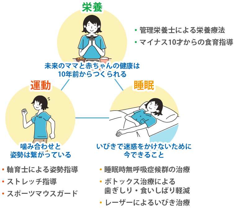当院では、歯科治療に加え、管理栄養士による食事指導と栄養指導、そして軸育士による姿勢指導やストレッチの指導を通じて、全身の健康をサポートしています。管理栄養士の指導のもと、食事の面から生活習慣の改善を行い、歯の治療をしたことをきっかけに歯にとって身近な食から、全身の健康、生活習慣病について考えていただきたいと思います。また、悪い姿勢は悪い歯並びへと繋がるため、軸育士による姿勢指導を行い、間違った舌癖や呼吸の仕方の根本の原因となる姿勢を子どものうちから修正いたします。飲み込む力や噛む力、滑舌や舌の動きを良くするための口腔内ストレッチの指導も行います。歯科治療だけでなく、食事や姿勢などの面からも健康のサポートをし、患者様の健やかな毎日を実現いたします。