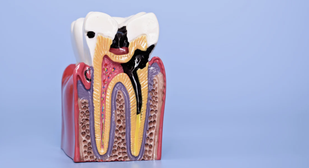 根管治療は、歯の神経や血管が感染や損傷を受けた場合に行われる治療法です。歯の内部には「歯髄(しずい)」と呼ばれる組織があり、神経や血管が通っています。むし歯が進行して歯髄まで達すると、強い痛みや腫れが生じます。この状態を放置すると、最終的には歯を失うことになりかねません。