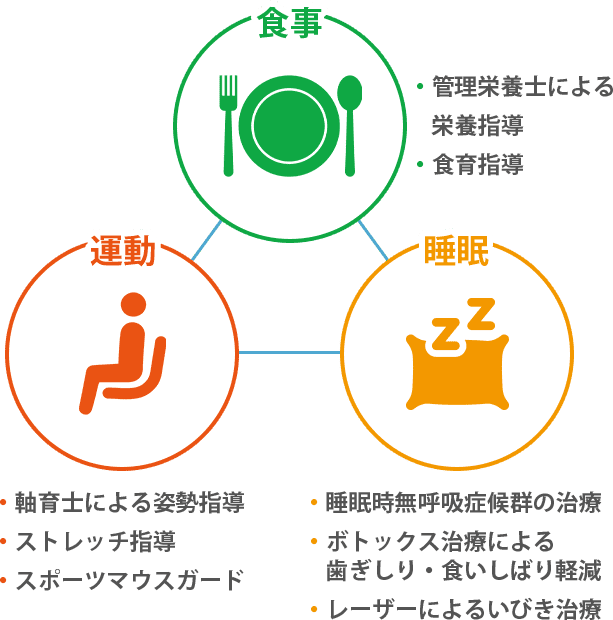 当院では歯科治療だけではなく、食事・運動・睡眠の健康の3要素からも皆様の健康をサポートいたします