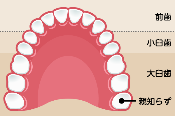 親知らずは、口の奥に生えてくる最後の歯です。日本人はあごが狭いことが多いため、親知らずが正しい位置に生えないことがあります。その結果、歯並びに影響を与えたり、前の歯を押してトラブルが起きたりします。また、親知らずが正常に生えていても、磨きにくいためにむし歯や歯周病になりやすくなります